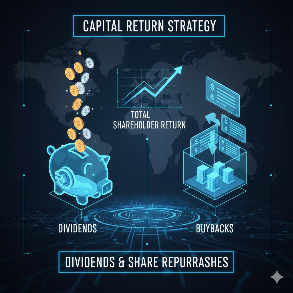 - Pääoman palautus: Aktiiviset omien osakkeiden takaisinostot ja avokätinen osinkopolitiikka.